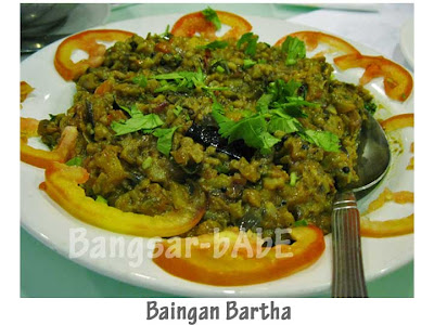 The Baingan Bartha (dry eggplant curry) is one of our favourite dishes. The eggplant is roasted till tender before being mashed. It is then sauteed with garlic, onions and tomatoes in hot ghee, and seasoned with mustard seeds, curry leaves, coriander and Indian spices.