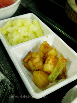 The two banchans were boring — the potato was bordering tasteless while the radish was a poor substitute for kimchi.