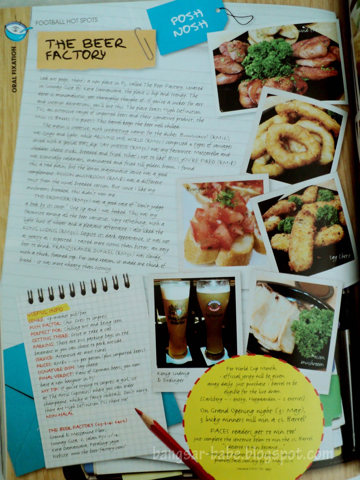 FeatureFood ReviewsFACES Magazine, May ’10 by Bangsar Babe May 26, 2010 May 26, 2010592FOOTBALL HOT SPOTSI know it’s a bit late (I just saw the mag myself),but go grab a copy at your nearest newsstand!The Beer Factory — love the interior decor! Piccadilly — cheap beer, affordable finger food.Another feature in FACES: With Thanuja & Renee at Hennessy Artistry FacebookTwitterPinterestWhatsappYou may also like Paik Siong, Puchong October 10, 2025 SS Spicy Food, Kampung Attap October 9, 2025 GulaiNya, Bukit Damansara September 10, 2025 Song Lim Restaurant August 12, 2025 Bangsar Venicia July 3, 2025 Choon Guan Hainan Coffee May 19, 20253 comments iamthewitch May 26, 2010 - 8:49 amOh nice piece! Though I'm not a football fan.. was paying more attention to the food instead. LOL! Reply AugustDiners May 27, 2010 - 2:03 amya i think i saw this piece in the mag stand~ u look really pretty in it! Reply Bangsar-bAbE June 9, 2010 - 6:42 amAugustDiners – Thanks!iamthewitch – Hahaha…me neither. I can't sit through a game without fidgeting. =P Reply Leave a Comment Cancel ReplySave my name, email, and website in this browser for the next time I comment.