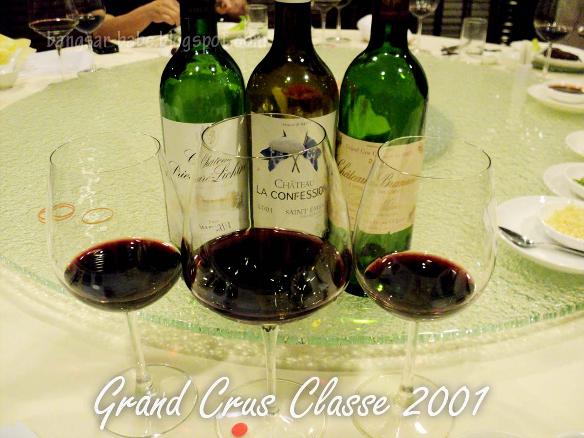 From l-r: Ch. Prieure-Lichine Margaux Grand Cru Classe 2001,Ch. La Confession St.Emilion Grand Cru Classe 2001, Ch. Branaire Duluc-Ducru St.Julien Grand Cru CLasse 2001.