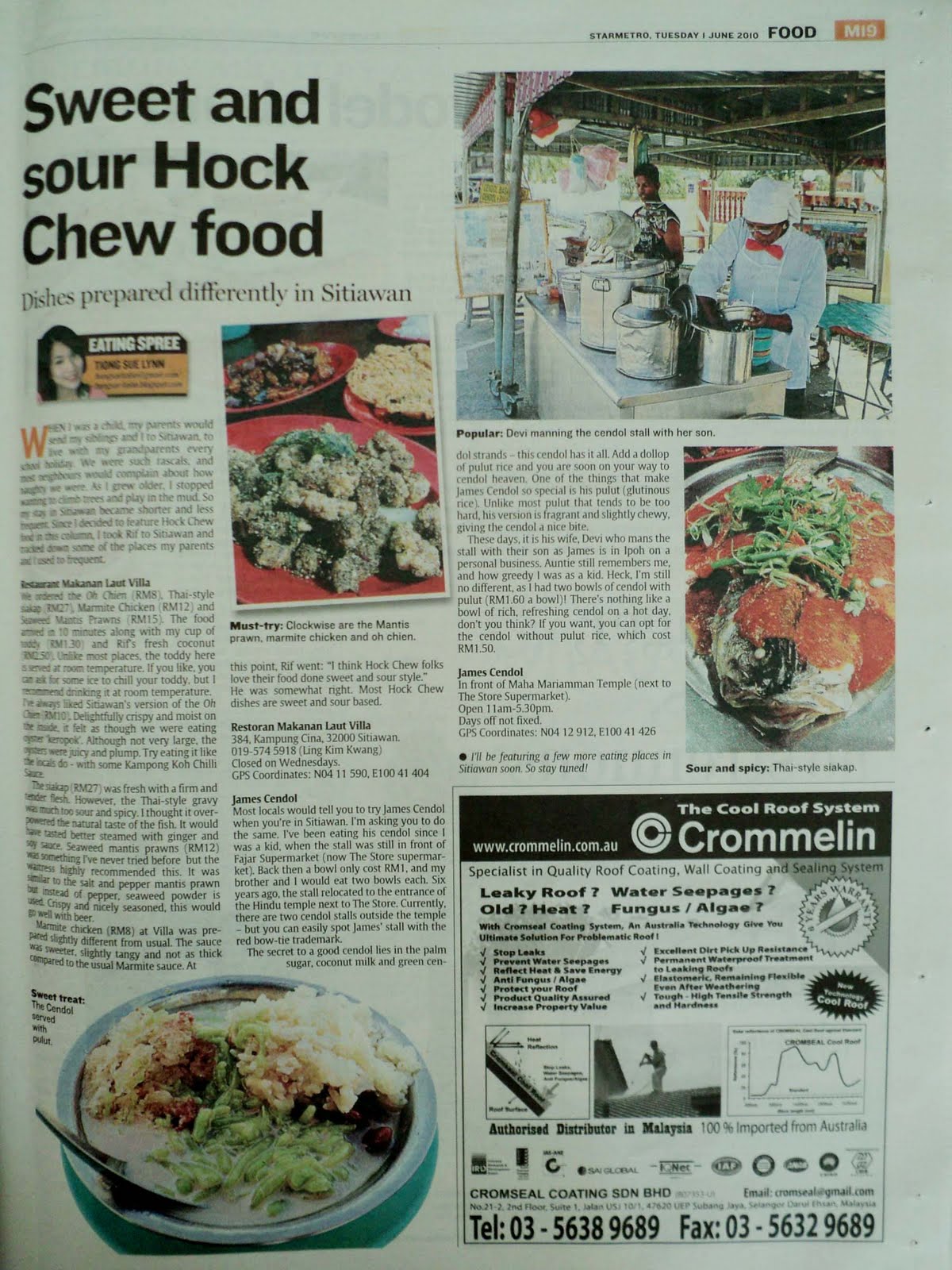 FeatureFood ReviewsSitiawan Good Eats – StarMetro June 2010 by Bangsar Babe June 1, 2010 June 1, 2010636About time I covered my parent’s hometown, Sitiawan.Read the article HERE! FacebookTwitterPinterestWhatsappYou may also like Paik Siong, Puchong October 10, 2025 SS Spicy Food, Kampung Attap October 9, 2025 GulaiNya, Bukit Damansara September 10, 2025 Song Lim Restaurant August 12, 2025 Bangsar Venicia July 3, 2025 Choon Guan Hainan Coffee May 19, 20255 comments "Joe" who is constantly craving June 1, 2010 - 1:48 amaiks, i dont get the star on weekdays, so looks like i will be contended reading from here! Reply Baby June 1, 2010 - 2:48 amwhat is toddy? Reply thule a.k.a leo June 1, 2010 - 3:57 amNo National Edition for Metro in Pahang 🙁 Reply ~Thinke®~ June 1, 2010 - 4:06 amAh~ I think i've been there before.. couldn't remember but the name sounds familiar as my friend is from sitiawan also… good food~ =) Reply Bangsar-bAbE June 9, 2010 - 7:11 am~Thinke®~ – Yup. And cheap too!leo – Aww…nvm, can read from my blog! 😉Baby – It's Malaysian coconut wine.Joe – Can read online ma! Reply Leave a Comment Cancel ReplySave my name, email, and website in this browser for the next time I comment.