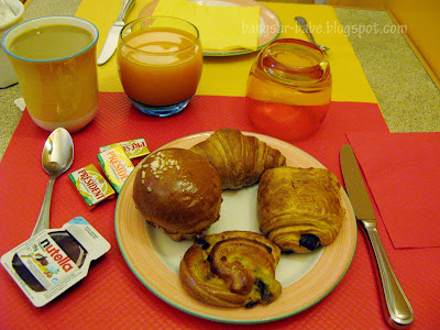 This was what I had for breakfast at my hotel in Paris. The bread and pastries were very good — especially the croissants and pain au chocolat. I ate plenty of those (3-4 pieces each). The croissants were lovely with butter and nuttela spread.