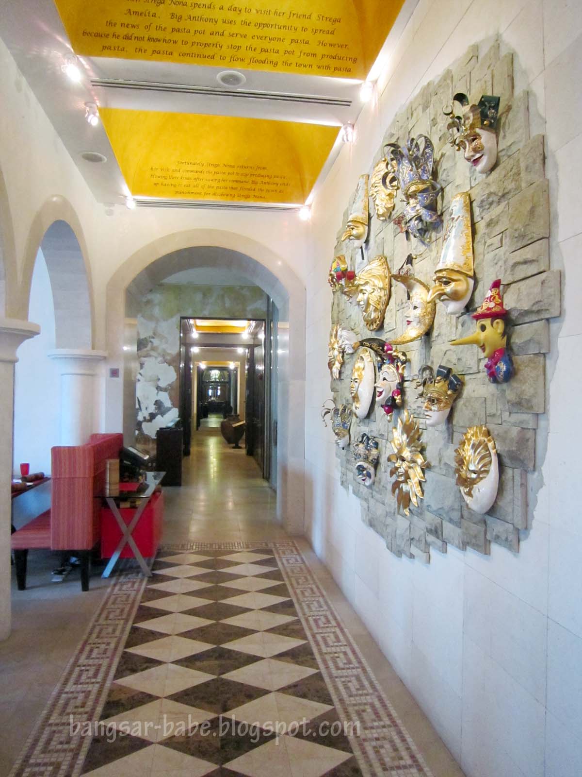 Venetian face masks, plush red chairs, a large painted mural and wooden beams gave the place a rustic yet whimsical feel. The black and white tiles on the floor made me feel like Alicein Wonderland, but without the Cheshire Cat.