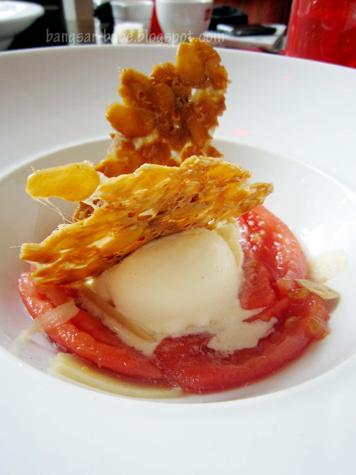 Cassata is an Italian dessert comprising sponge cake, ice cream, candied nuts and fruits. This was rich, dreamy and justly sweet. Poached plum tomatoes tasted decent to me, but according to Cheryl, the tomatoes were not properly poached that day.