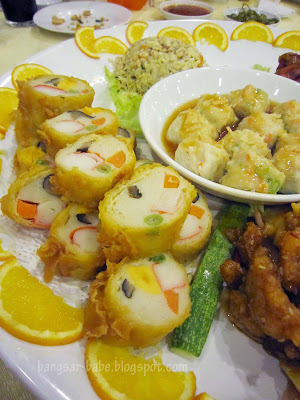 Iβm not sure if it should be called four seasons, because there are five items in the dish. This platter comprised a βloh bakβ roll, shredded egg omelette, baby octopus, deep fried pork with a sweetish sauce and βdim sumβ at the centre. I tasted salted egg yolk, fish paste, crabstick and carrot in the loh bak β very nice.