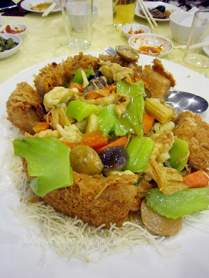 The fourth course was my favourite β fish paste topped with chicken skin, chicken wings and prawn fritters salad. The chicken skin was crispy to the T, and I loved how it complemented the firm yet bouncy fish paste. Portion was big so I got to eat more. The poor bride didnβt get to eat her food — she was busy mingling with everyone.Note to self: Make sure my portion of food is packed during my wedding dinner and sent to the bridal suite!