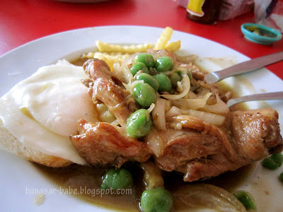 One of Sun Sun Nam Cheong’s signature dishes is the chicken chop.For RM10, you get a plate of pan-fried chicken topped with light brown gravy, green peas, onions, French fries and a sunny side up on a slice of toast.