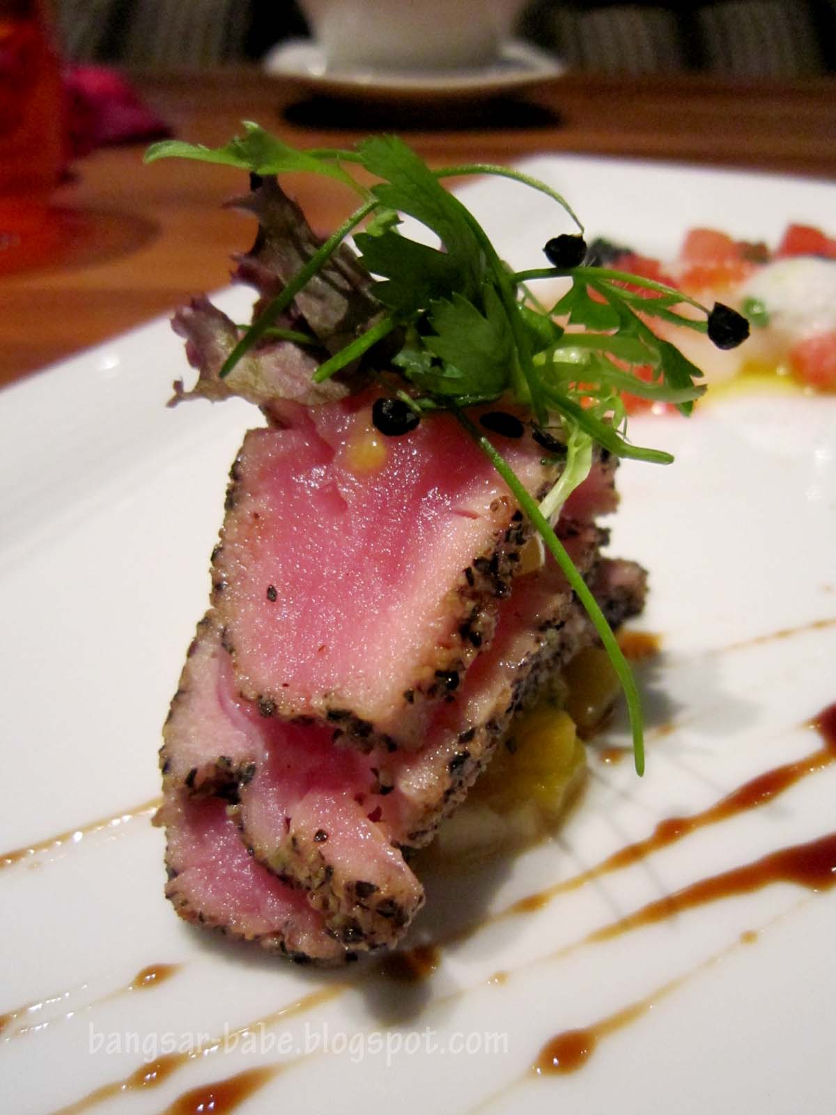Dinner started with an Antipasti platter comprising sea scallop carpaccio with Avruga caviar and pepper crusted bluefin tuna with mango salsa. The scallop was sweet, plump and tender; I was told they were imported from Japan, hence the sweeter taste.