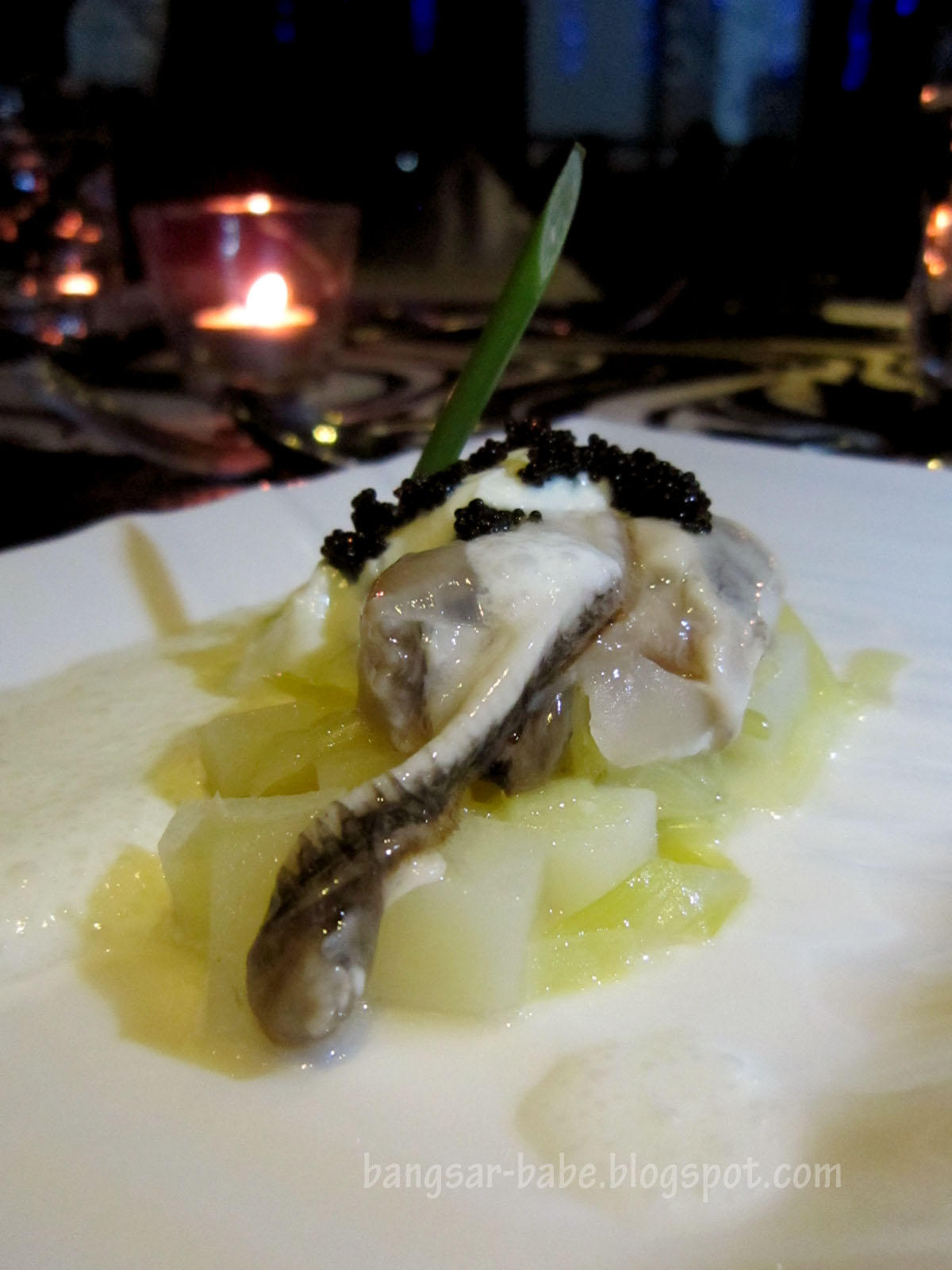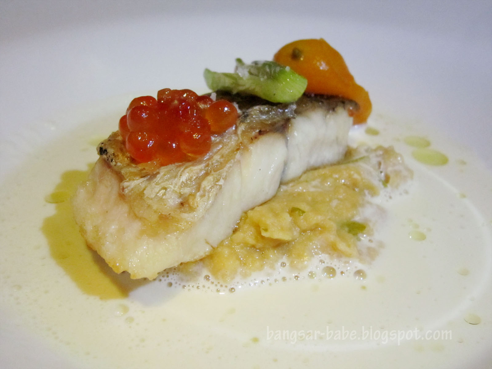 I’ll be honest; I was surprised when the bowl of ‘soup’ was placed in front of me. There was no broth on that porcelain white bowl, except a blob of cold, creamy matter, croutons and an onion ring on top. My waiter then came with a jug and poured the hot onion broth into my bowl. The creamy matter turned out to be onion ice cream. This was interesting to eat; the heady broth was subtly flavoured by the ice cream (which tasted like vanilla ice cream, if it wasn’t for that hint of onion aftertaste). The soup was consumed cold and I enjoyed this.