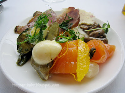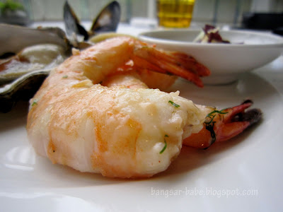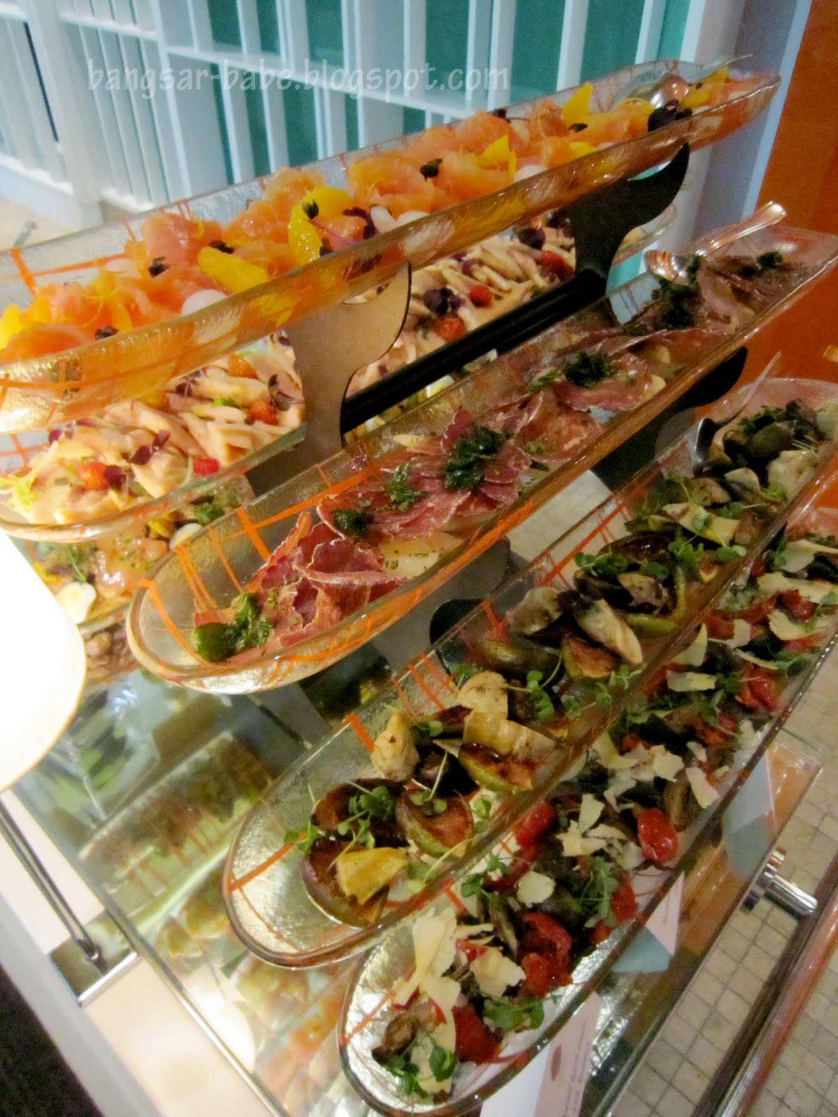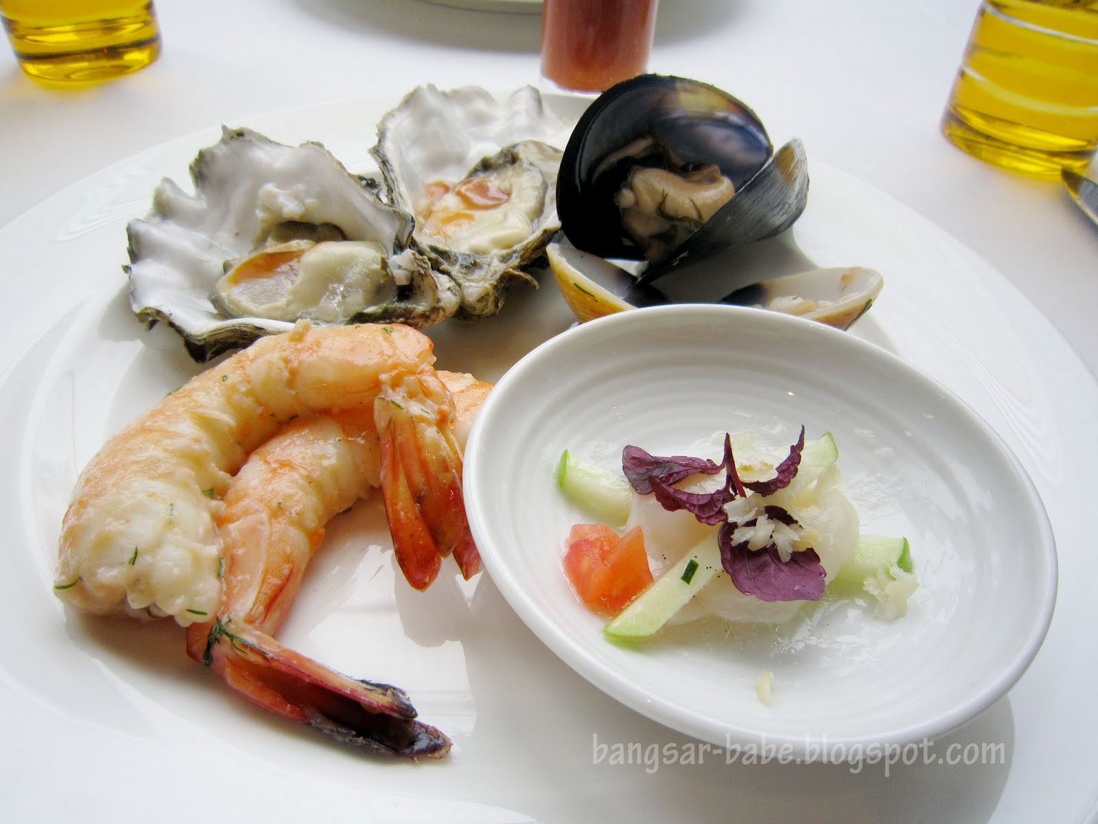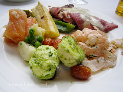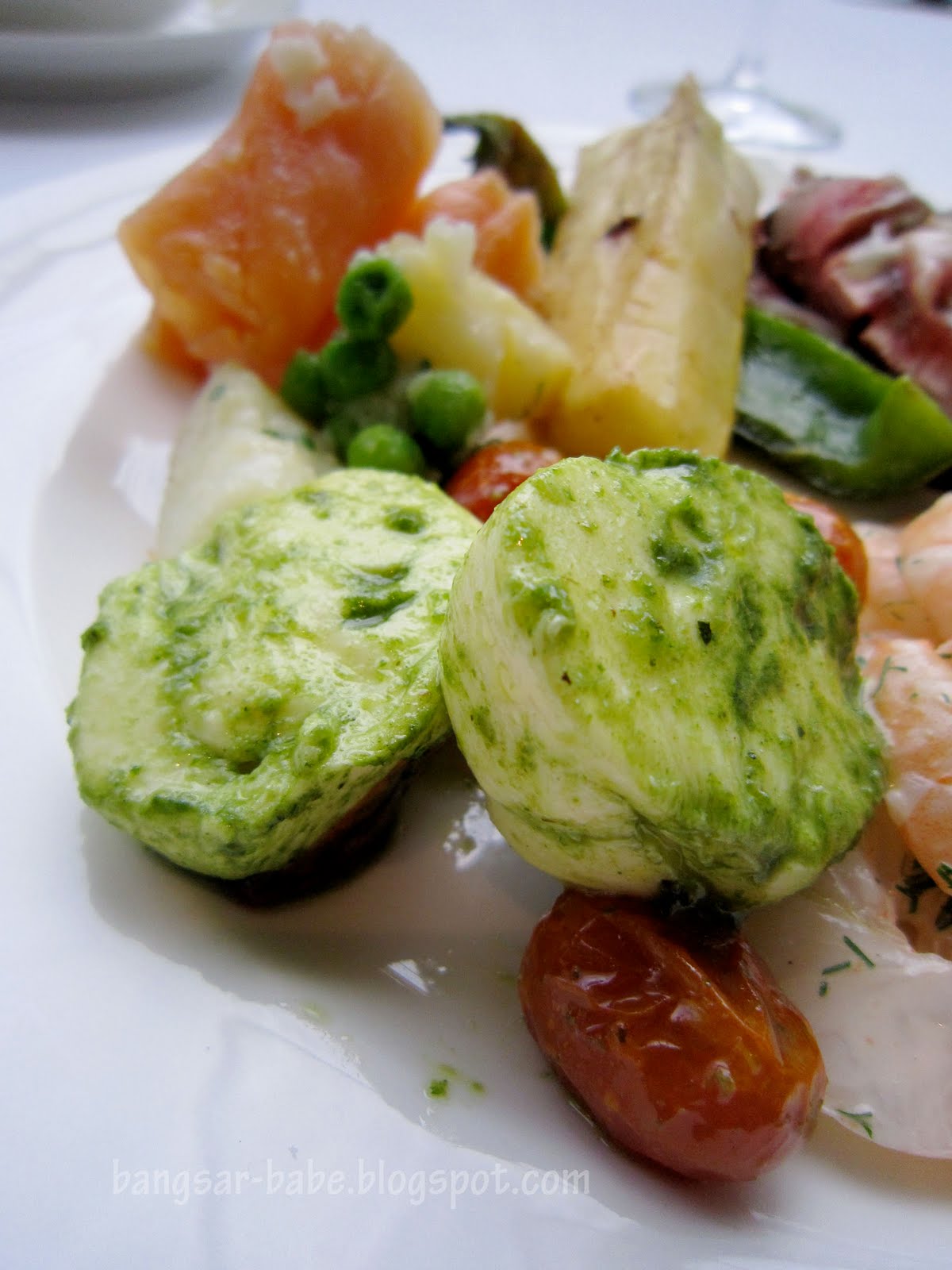 I walked around the spread for a while, not knowing where to start! Cheeses, pastries, freshly baked breads, luscious butter, seafood bar, salad bar, tapas…I was spoilt for choice. Appetizer and antipasti were prepared in small, individual portions and the assortment of amuse bouche tasted as good as they looked. The seafood bar comprised mussels, clams, tiger prawns, eagles rock oyster and crabs, with a choice of shallot xeres vinegar, Rosemarie sauce, cocktail sauce, Tabasco, wasabi mayonnaise as a complement.