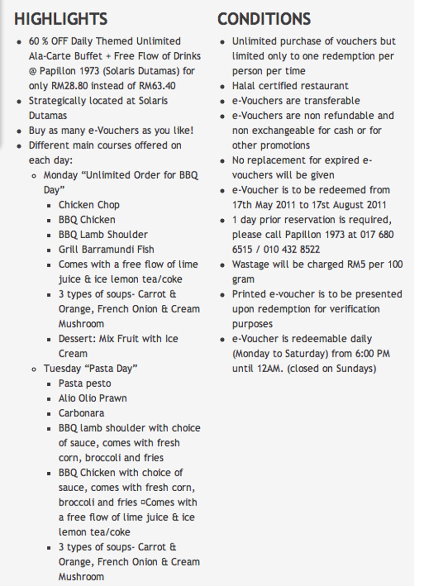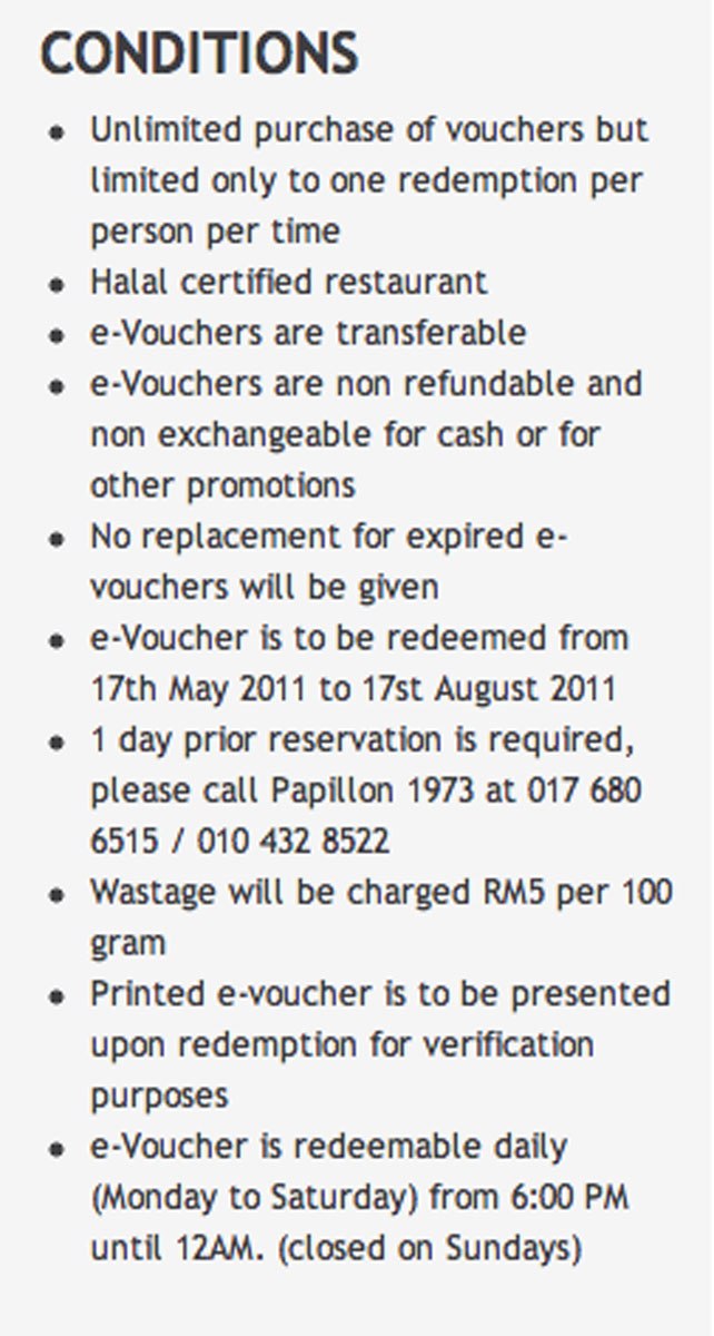 This deal offered diners a 60% discount on Papillon 1973’s ala-carte buffet, so we paid RM28.80 instead of RM63.40. Soon, customers who bought the same deal started complaining about the restaurant and food on the “discuss this deal” section of the page. This has since been removed from the site. When I tried redeeming my deal last week, I was told (rudely) by a man named Sam that there was no such promotion! I then called the next guy Peter who asked me to text him my reservation details.