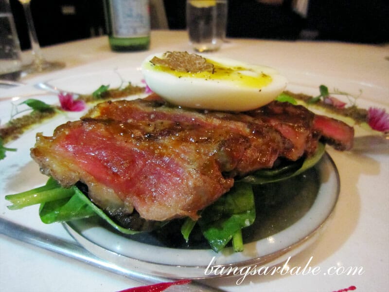 The breads are pure evil; you can never stop at one slice. Together with the trio of butter on the side, we ate slightly more than a serving of bread before getting down to some serious steak business, starting with the Sher Sirloin Steak Tataki (RM208++). Topped with half an egg โ runny yolk โ and a slice of truffle, the just-seared beef was ultra tender and juicy with a superb flavour. A prelude of many good things to come.